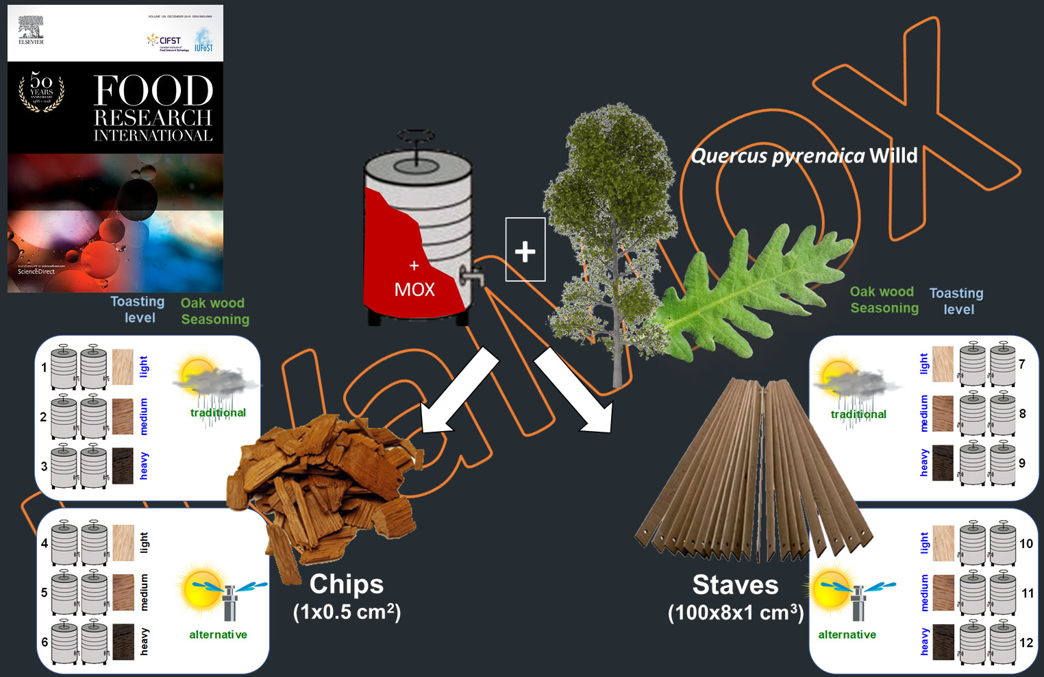 Seasoning and toasting treatments carried out in cooperage influence the chemical composition of the oak, and these treatments affect different oak species in different ways. For this reason, numerous studies have focused on the evaluation of both the oak wood materials and the resulting aged wines in order to optimize the different cooperage processes. Seasoning involves immobilizing the wood for long periods of time, leading to an increase in the price of the final product. When using alternative products instead of barrels, in addition to the seasoning and toasting of the wood, the size of the wood pieces is a determining factor in the characteristics of the final wine. Therefore, the objective of this work was to evaluate the polyphenolic composition of the same red wine aged with different alternative products and a small amount of oxygen for 120 days. Specifically, the effect of 2 types of seasoning and 3 types of toasting of chips and staves made from the wood of Q. pyrenaica Willd. was studied. The results showed that the size of the alternative product was the factor that determines the phenolic composition of the wines over the entire ageing process, independent of the seasoning or toasting method carried out on the wood.