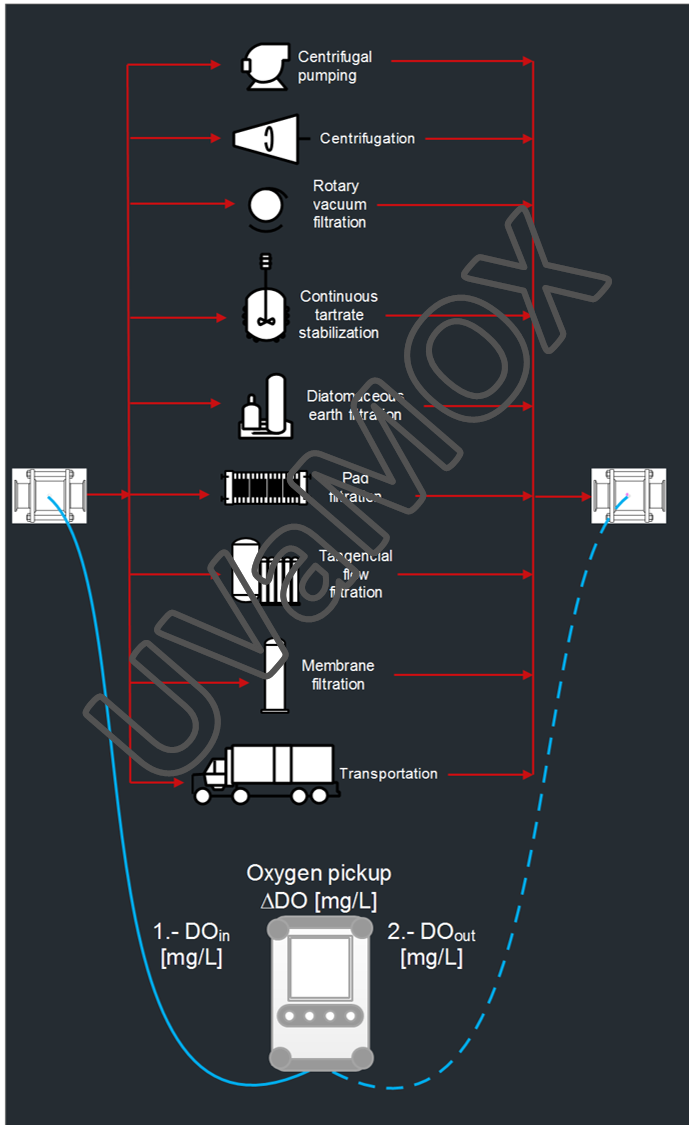 Oxygen has a determining effect on the quality and longevity of wines. In spite of its importance, there are only a limited number of reports examining the levels of dissolved oxygen during wine production and the enrichments produced by different operations. In this study, the contribution of selected winemaking equipment and operations (i.e., pumping, centrifugation, tartrate stabilization, filtration and bulk wine transportation) on the concentration of dissolved oxygen in wines was assessed using a photoluminescence-based oxygen meter. For example, winemaking equipment such as diatomaceous earth filtration and membrane filtration caused dissolved oxygen increases between 0.100 and 0.200 mg/L, and pad filtration and centrifugation showed average oxygen enrichments of approximately 0.350 mg/L. However, operations such as filtration with rotary vacuum equipment and continuous tartrate stabilization produced oxygen enrichments up to ~2.8 mg/L. A better awareness of the levels of oxygen incorporated by different winemaking practices will help incorporate the necessary safeguards to protect wines from oxidation and estimate the magnitude of the cumulative exposure to oxygen during winemaking.